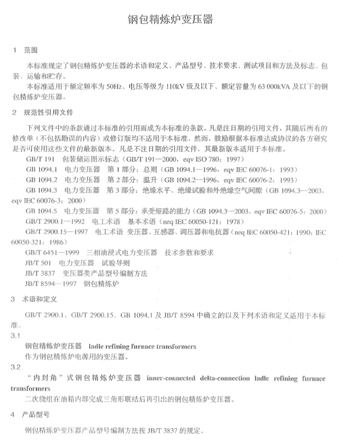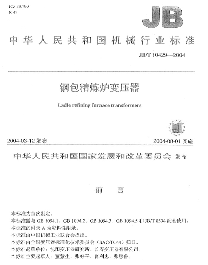 JB-T10429-2004钢包精炼炉变压器标准