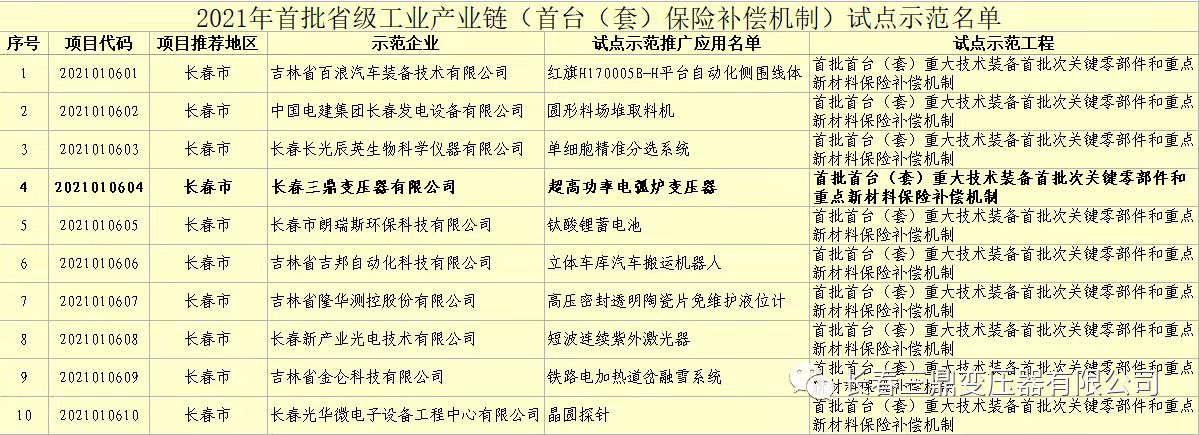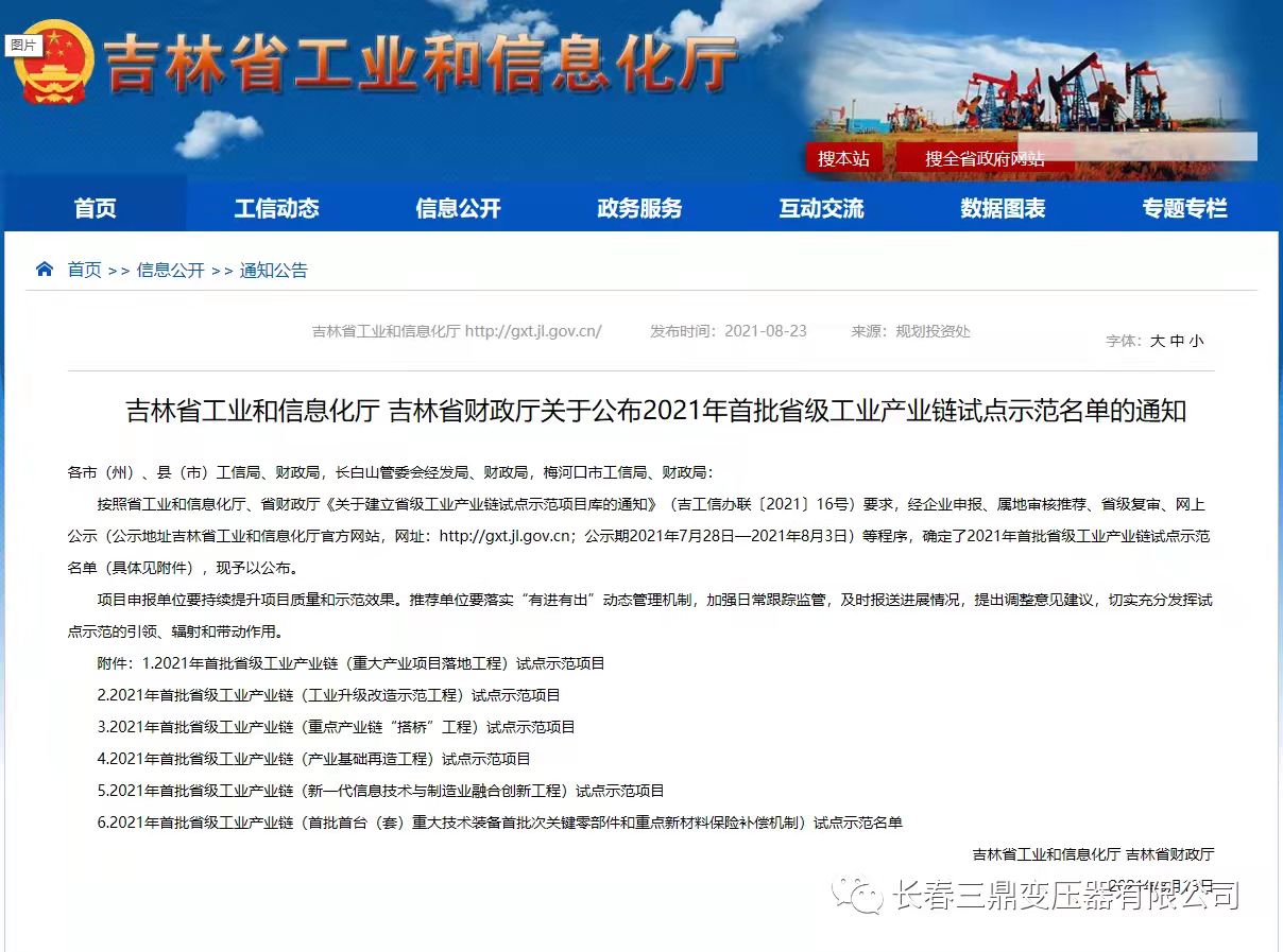 近日,吉林省工业和信息化厅公布了《关于2021年首批省级工业产业链试点示范名单》,我公司的HSSPZ-140000/35超高功率电弧炉变压器成功入选该名单。