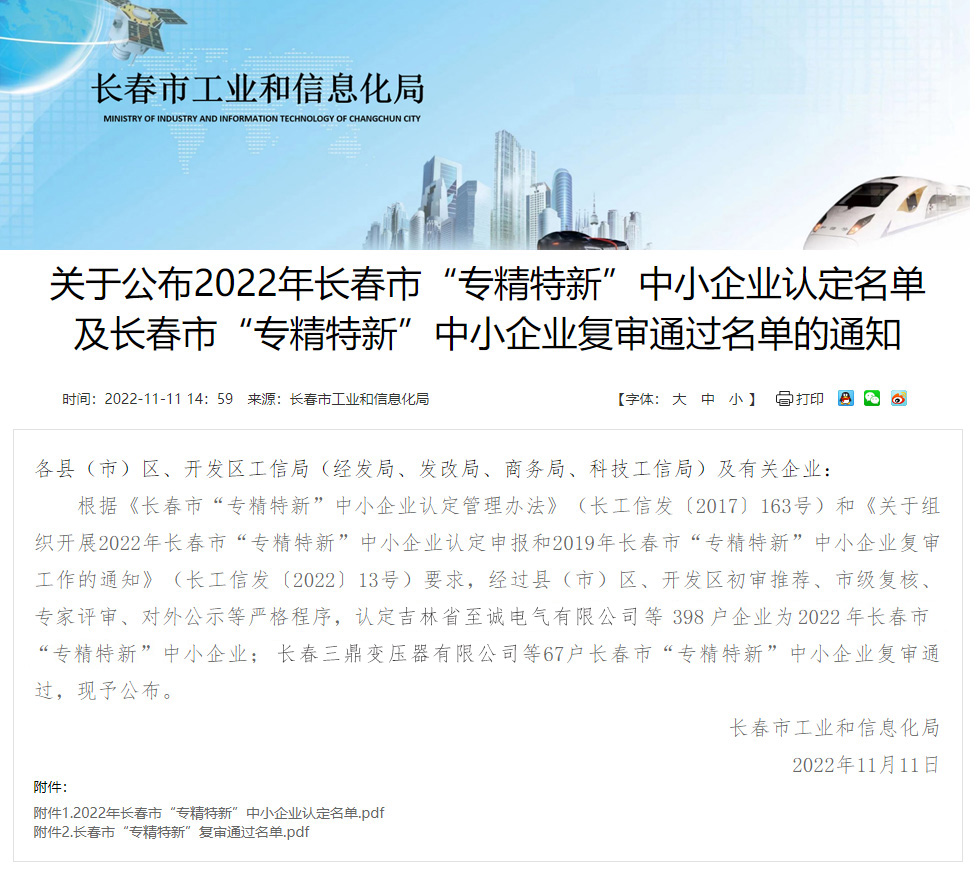 “专精特新”是指具有“专业化、精细化、特色化、新颖化”特征的中小企业,同时也是专注于细分市场、创新能力强、市场占有率高、掌握关键核心技术、质量效益优的模范企业。获得此次荣誉,是对我公司和至诚公司创新发展成就的肯定,标志着我们在企业创新发展方面又迈向一个更高的台阶。未来,我们将再接再厉,增强核心竞争力,不断提高创新能力,在引领全市中小企业“专精特新”发展方面做好表率,为长春市经济社会发展做出更大的贡献。